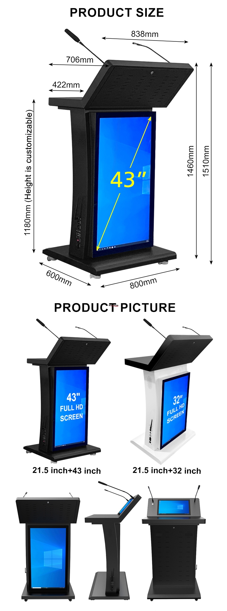 Touchscreen: The podium is equipped with a touchscreen, allowing presenters or teachers to perform operations such as annotation, writing, drawing, and more through touch.