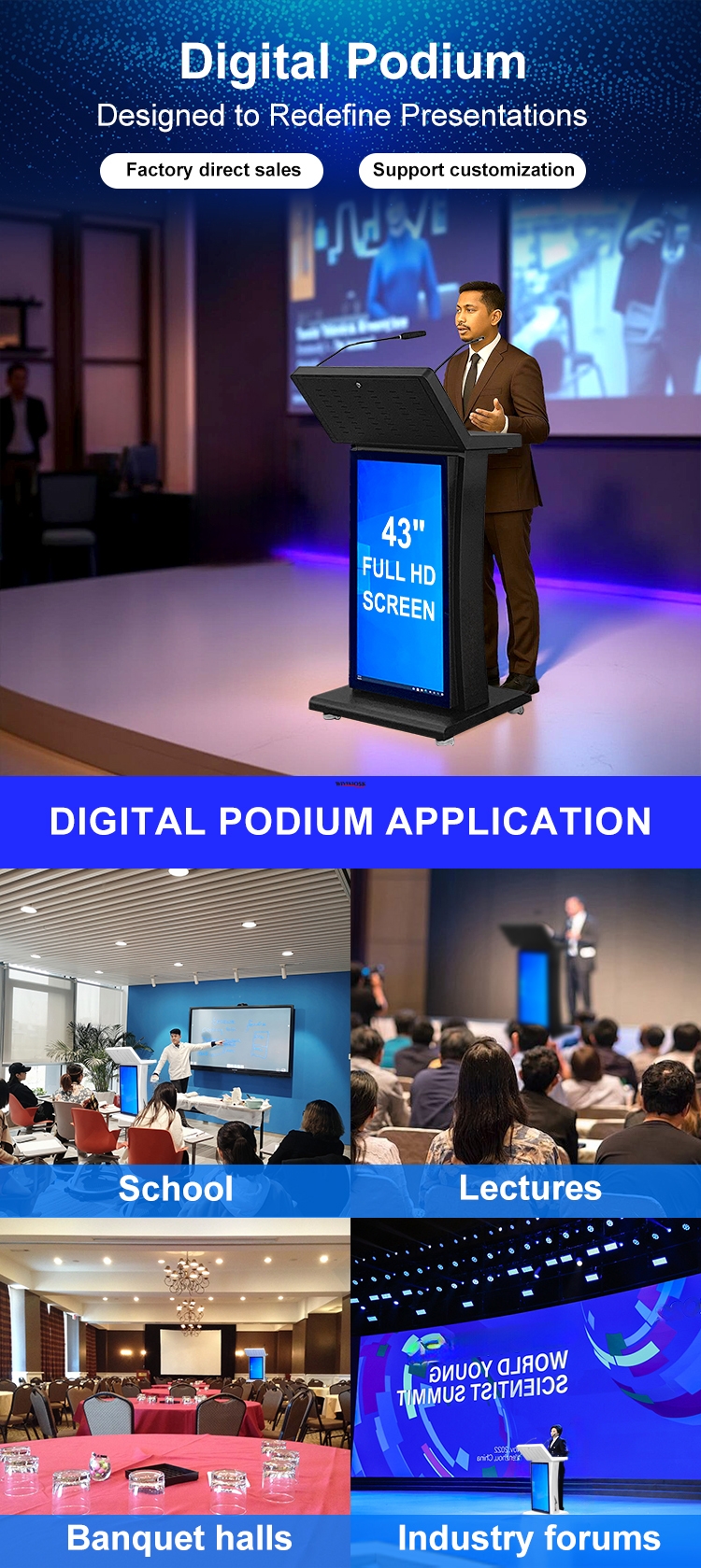 In summary, Smart Podium combines digital technology with interactive design to offer a modern presentation and teaching tool, meeting the diverse needs for interactivity and enhanced effectiveness in different fields.