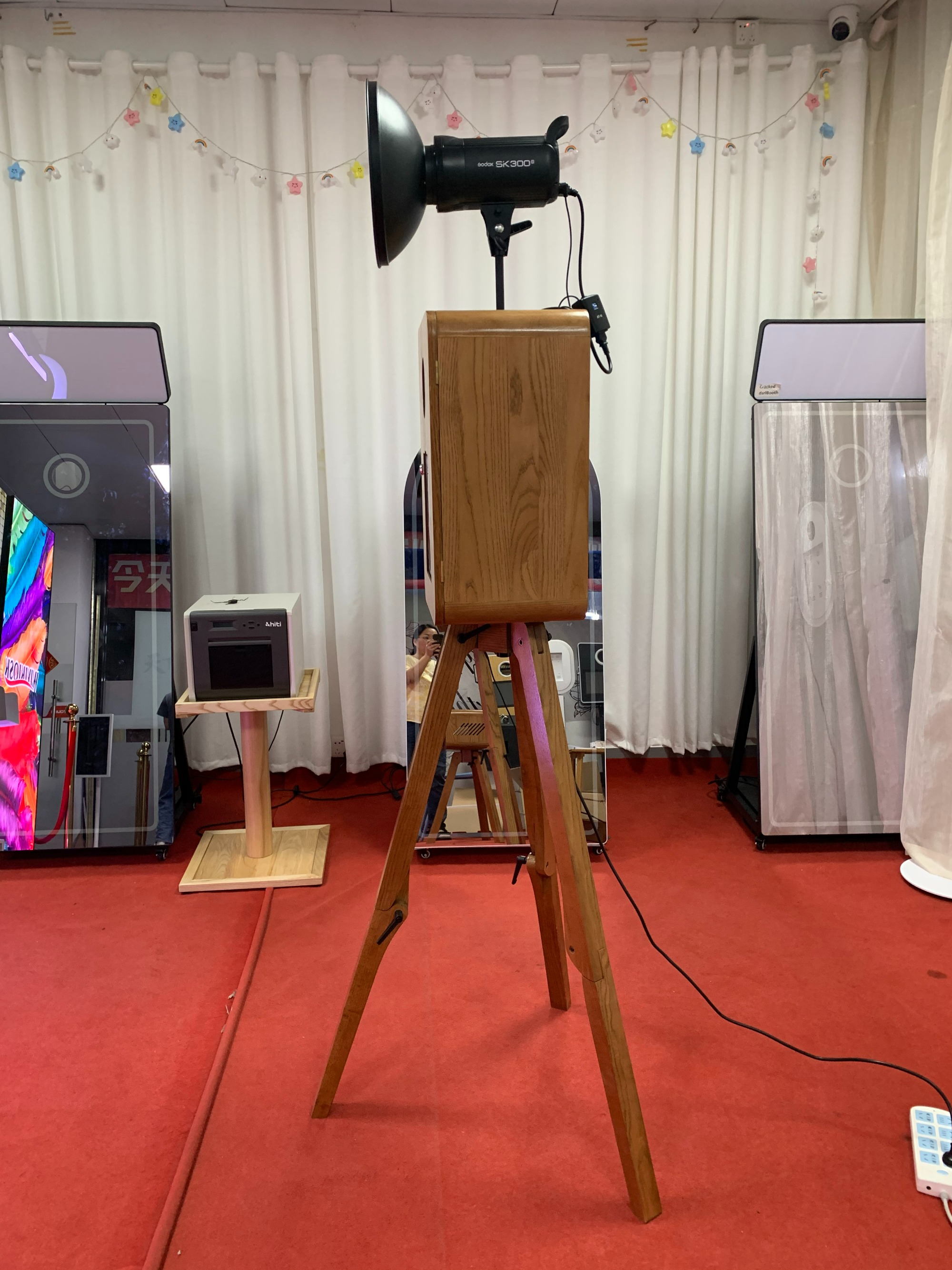 Elegant 18.5-inch wooden tripod photo booth combining vintage charm with cutting-edge technology. Perfect for events, retail spaces, and studios seeking stylish, professional photo solutions.
