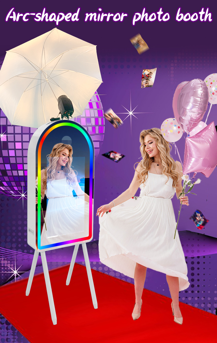 The Unique Arc-top Design: The Arc-top Magic Mirror Photo Booth stands out with its elegant curved top, reminiscent of a classic fairytale mirror. This design not only adds a touch of sophistication to any venue but also invites curiosity and excitement from guests, making it an irresistible attraction at weddings, parties, and corporate events.
