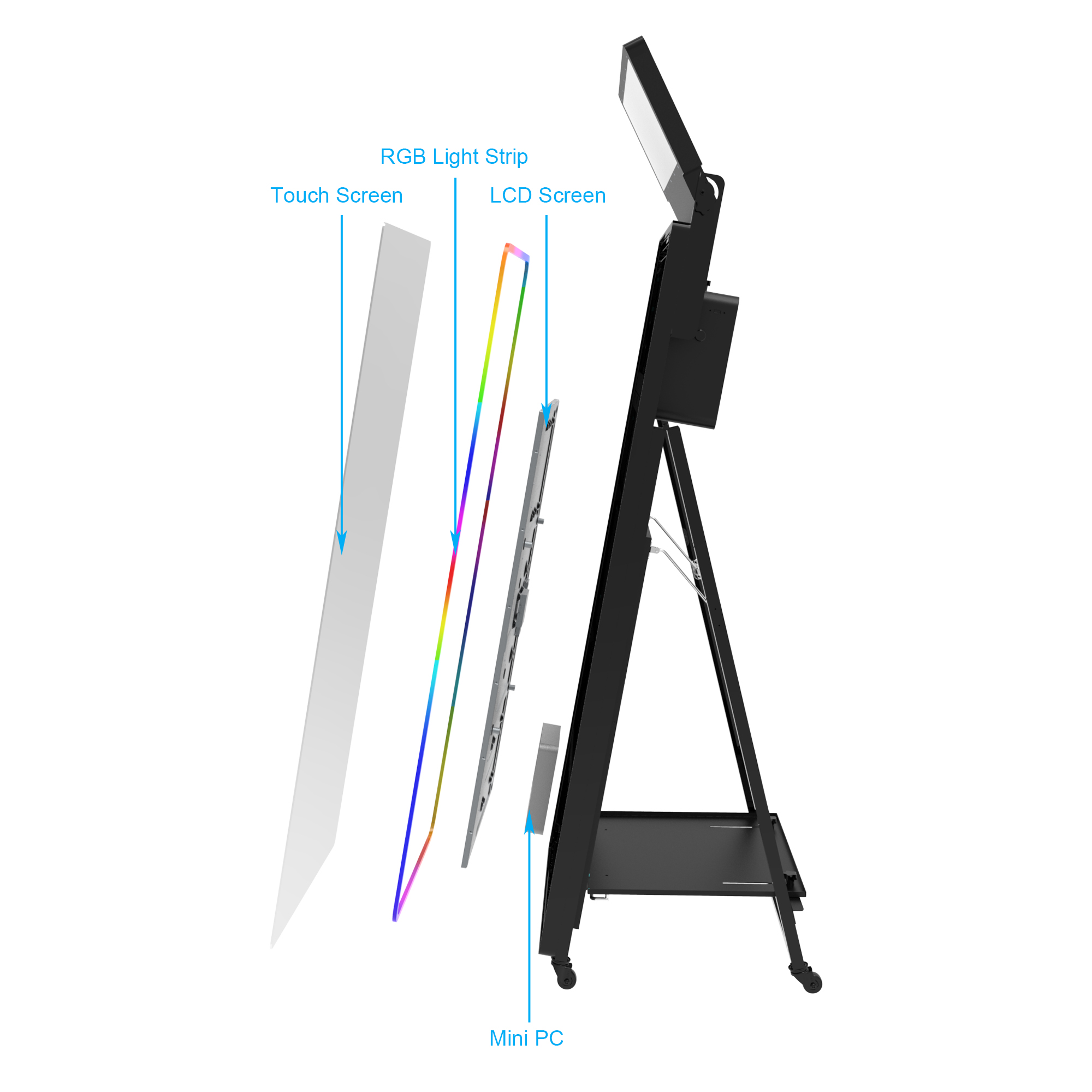 The Magic Mirror Photo Booth is a new, fun, and engaging way to take photos at your event. The Magic Mirror Photo Booth will guide your guests through the experience using sounds from the hidden speaker and animations on the screen.