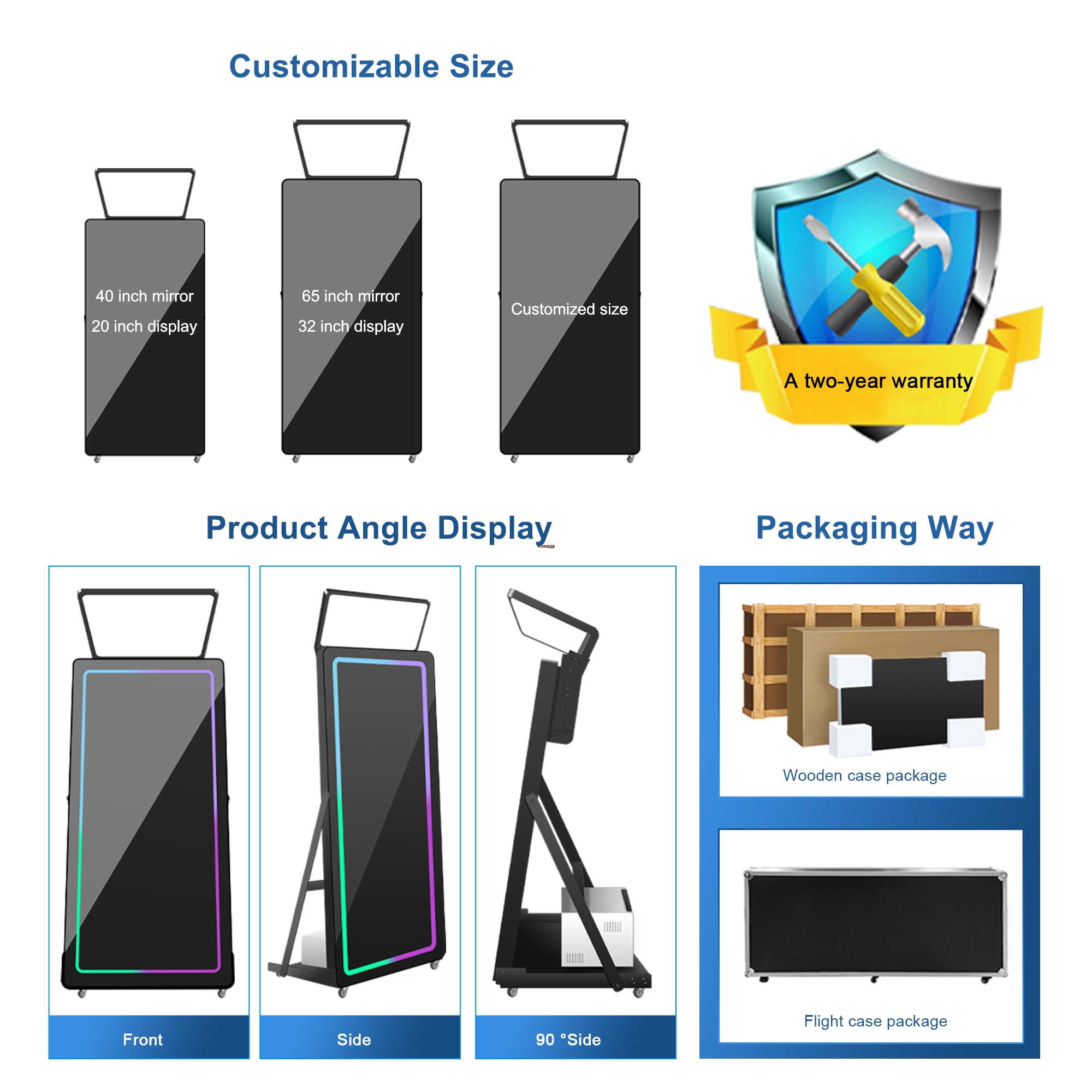 Using an innovative idea, your groups and friends can all come together for the funniest photo opportunities by using our full length mirror which is touch sensitive and with full instructions asking you to pose prior to taking your picture. Our mirrors come with the eye-catching Hollywood Lights, English Garden frame, with flowers to match the colors of your event, Black & White Frame or Mobile Phone Frame.