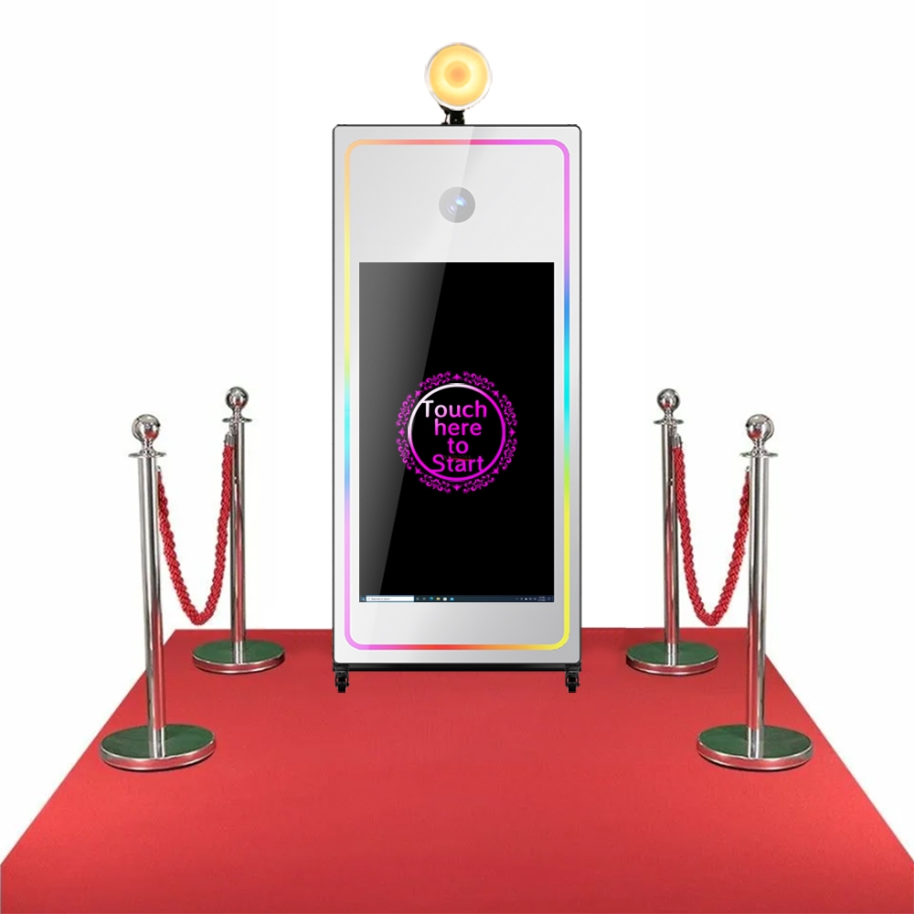A magic mirror photo booth with a built-in flash combines mirror effects and integrated flash for bright illumination. Widely used at events, it offers a fun interactive experience, capturing unforgettable memories even in low-light conditions.